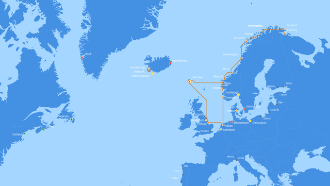The Orange Line operates four vessels between Norway and Europe. Vessels are on a regular weekly rotation, as specified in the Schedule. The service can be described as semi-liner since we have fixed calls to certain ports with the flexibility to call different ports on-route, and 2 of the vessels are geared with a 50-ton crane. Vessels can carry containers/flats, diverse project cargo on deck, and dry or chilled/frozen palletized cargo in the holds.